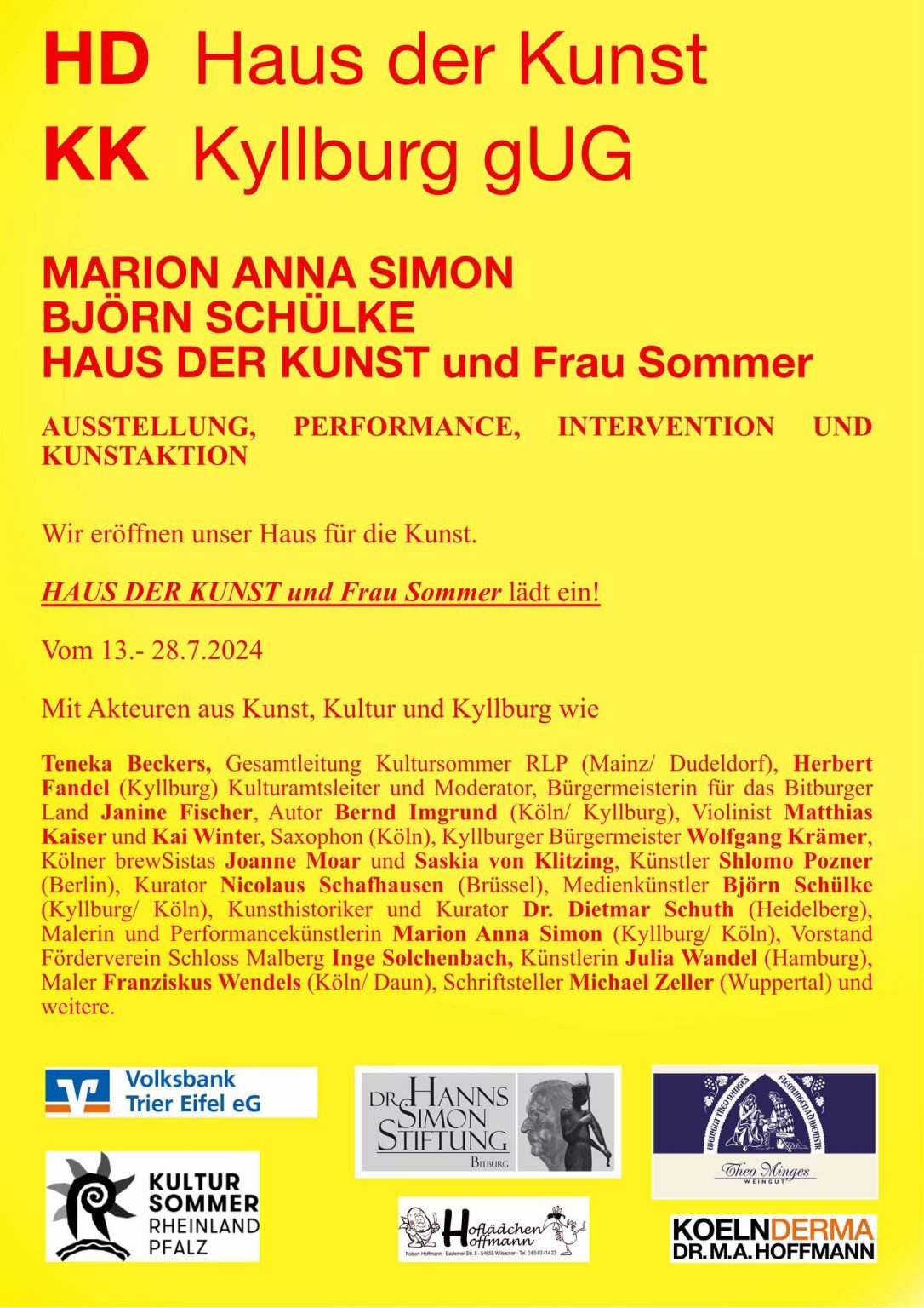 Mitten in Kyllburg – alte Kurstadt mit Grandhotels, Bohéme, vom Kaiser, großen Bällen, belebten Geschäftsstraßen bis hin zum Niedergang – haben Medienkünstler Björn Schülke und Malerin und Performancekünstlerin Marion Anna Simon 2023 ein Gründerzeithaus erworben und daraus das HAUS DER KUNST KYLLBURG gemacht.